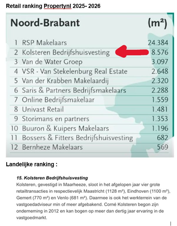 Kolsteren Bedrijfshuisvesting heeft een sterke positie behaald in de PropertyNL Retail Ranking 2025–2026. In deze landelijke ranglijst van retailadviseurs eindigt Kolsteren op een 2e plaats in Noord-Brabant en een 15e plaats landelijk. Deze notering is gebaseerd op gerealiseerde retailtransacties in…